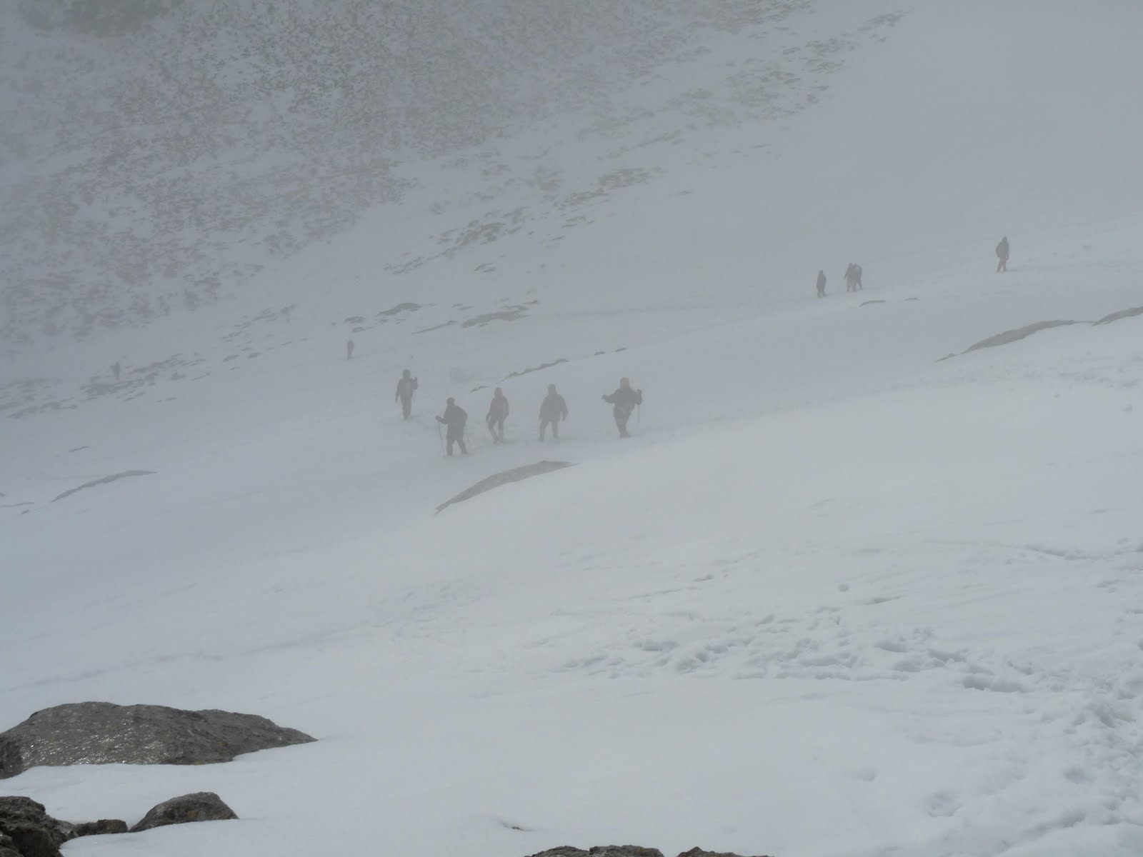 La pena fué no tener una esterilla o algo para deslizarse montaña abajo, y la nula visibilidad ya en la cima, donde empezó a caer una fina aguanieve que nos hizo bajar un poco antes de lo previsto. Ya en la bajada tuvimos un buen momento, cuando nos encontramos con unos locos de las 2 ruedas, Juan Carlos y Antonio, que tambien hacían su particular ruta dominguera, en la que también sufrieron de lo lindo...